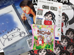 にょっきさん。スラッとした長身にお姫さま衣装で水樹奈々を歌うっていう視覚的なインパクト。『たけのこの里』配るよって言ってたから図々しくもホントにもらいに行ったら、わざわざ取ってきてくれました。いい人だー。いっしょにいた松田珠璃さんはフライヤーくれたんだけど、センスがイッちゃってていいすね。