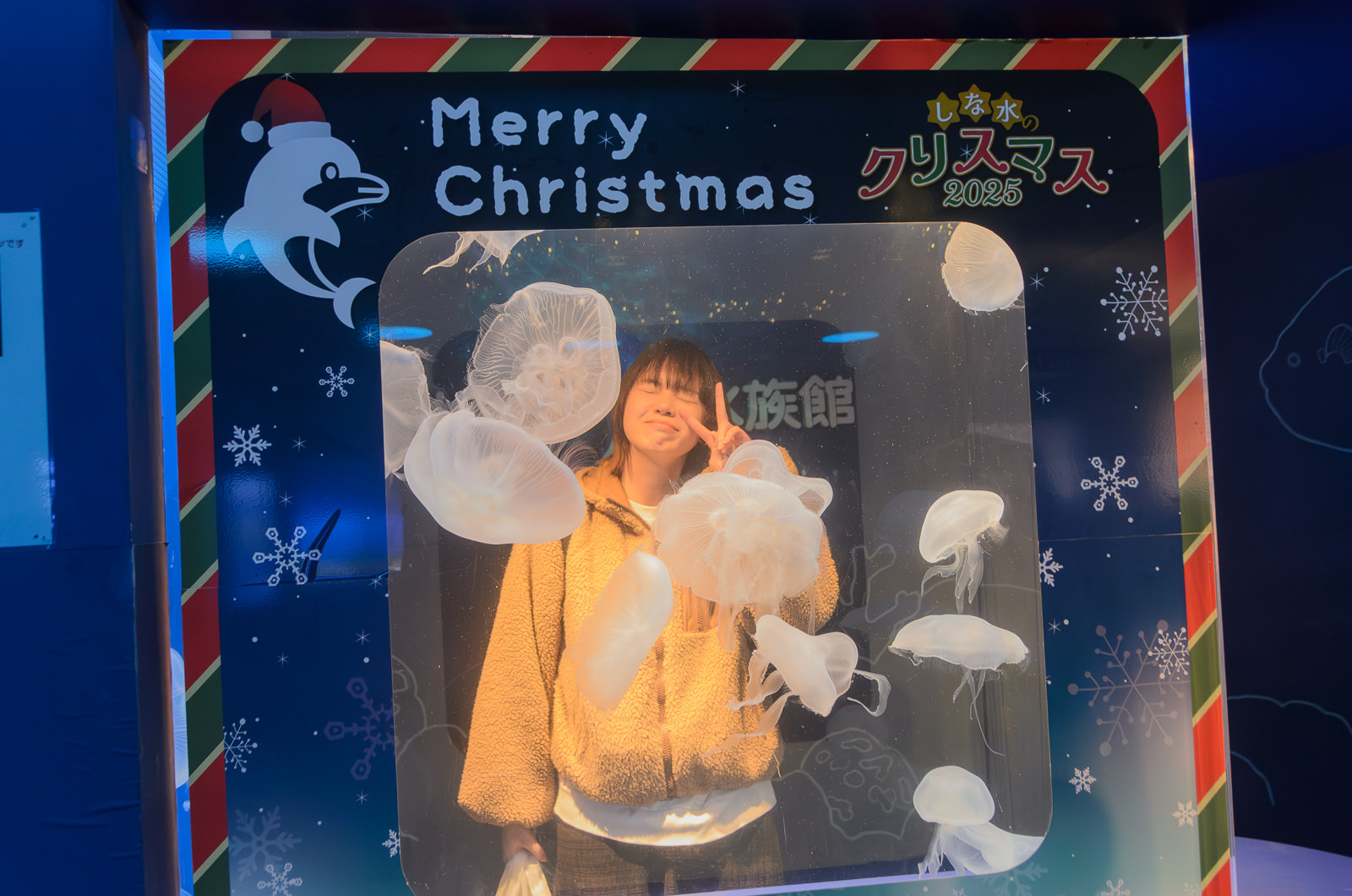 イルカショーもちょうどやってた。ここはショーだけ観覧料取ったりはしなくて、順路沿いからそのまんま観れる。けっこうな近さ。席は空いてなかったから後ろから立ち見だったけど、それでも迫力あった。僕はちゃんとみると感動しすぎて泣いちゃう(経験あり)んで、撮影してるぞとか、クリスマスソングに合わせて手拍子したりとか、気を紛らわしながら。