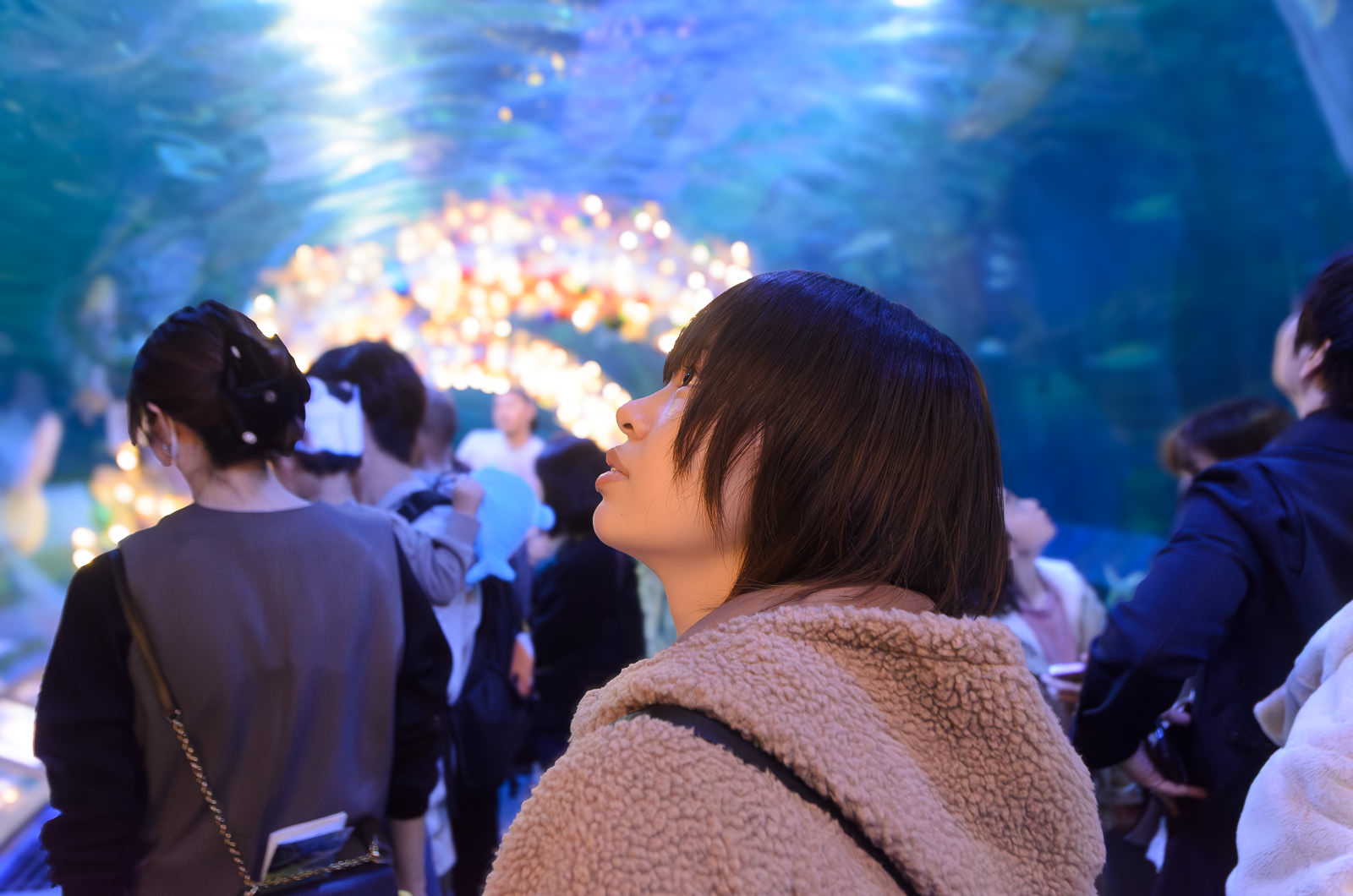 トンネル水槽は人気でなかなか人が進まない。僕らもいっしょにチンタラ歩く。ちーちゃんはウミガメがお気に入りらしく、シャッターチャンス(スマホで自撮りする方の)を狙う。その狙ってる姿を僕が撮る。