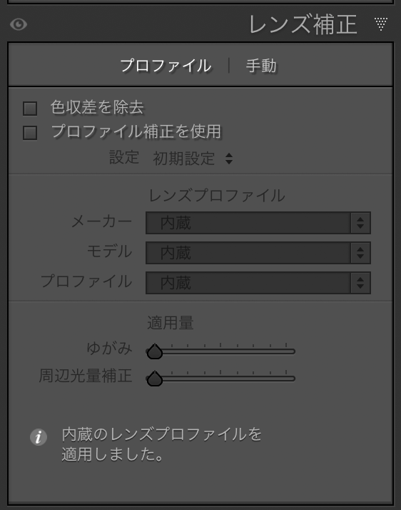 LrCに読み込んでみたところ、レンズ補正プロファイルがなかった。機種じゃなくメーカーとしてのオリンパスでそっくりナシ。そういえばそうだった。オリンパスはカメラ本体で補正しちゃうからないのだ。
